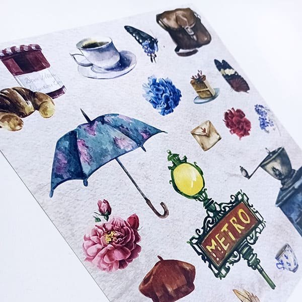 Paris Objects son papeles para scrapbooking impresos bifaz en ilustración mate 200 grs, con detalles de laca en una de las caras, listos para explotar tu creatividad.